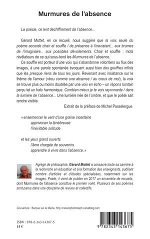 Gérard Mottet, en ce recueil, nous suggère que la voix seule du poème accorde chair et souffle/ de présence à l'inexistant aux brumes de l'imaginaire aux possibles dévoilements. Chair et souffle : mots révélateurs de ce qui sous-tend les murmures de l'absence.