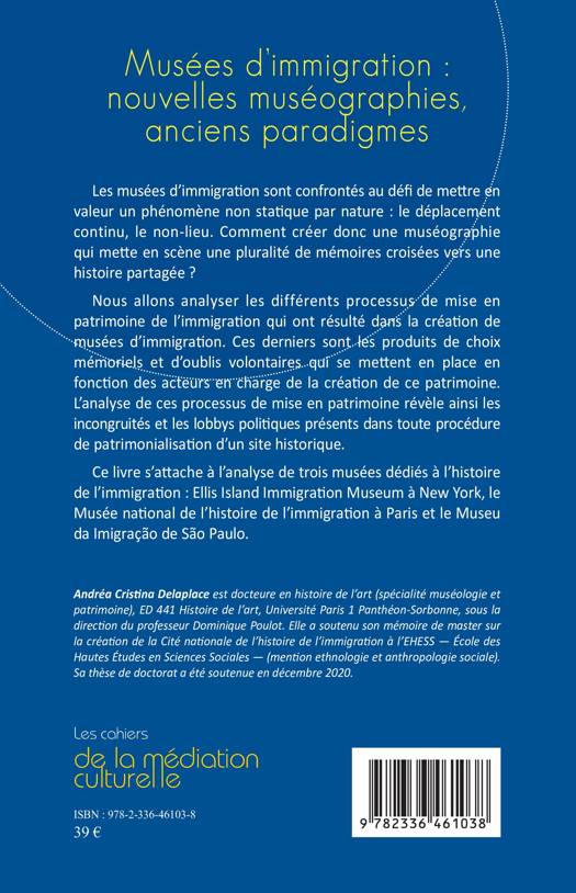 Les musées d'immigration sont confrontés au défi de mettre en valeur un phénomène non statique par nature le déplacement continu, le non-lieu. Comment créer donc une muséographie qui mette en scène une pluralité de mémoires croisées vers une histoire partagée ? Nous allons analyser les différents processus de mise en patrimoine de l'immigration qui ont résulté dans la création de musées d'immigration. Ces derniers sont les produits de choix mémoriels et d'oublis volontaires qui se mettent en place en fonction des acteurs en charge de la création de ce patrimoine. L'analyse de ces processus de mise en patrimoine révèle ainsi les incongruités et les lobbys politiques présents dans toute procédure de patrimonialisation d'un site historique. Ce livre s'attache à l'analyse de trois musées dédiés à l'histoire de l'immigration Ellis Island Immigration Museum à New York, le Musée national de l'histoire de l'immigration à Paris et le Museu da Imigração de São Paulo.