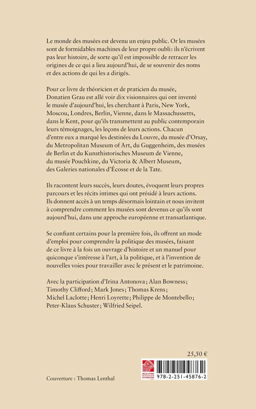 Pour ce livre de théoricien et de praticien du musée, Donatien Grau est allé voir dix visionnaires qui ont inventé le musée d’aujourd’hui, les cherchant à Paris, New York, Moscou, Londres, Berlin, Vienne, dans le Massachussetts, dans le Kent, pour qu’ils transmettent au public contemporain leurs témoignages, les leçons de leurs actions. Chacun d’entre eux a marqué les destinées du Louvre, du musée d’Orsay, du Metropolitan Museum of Art, du Guggenheim, des musées de Berlin et du Kunsthistorisches Museum de Vienne, du musée Pouchkine, du Victoria & Albert Museum, des Galeries nationales d’Écosse et de la Tate.