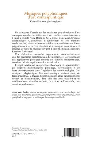 Un triptyque d'essais sur les musiques polyphoniques d'art contrapuntique cherche à faire savoir et connaître ces musiques nées à Paris, à l'École Notre-Dame au XIIIe siècle. Ces considérations généalogiques, complétant et synthétisant les trois premiers essais suscités, visent maintenant à faire comprendre ces musiques polyphoniques, à la fois héritières des musiques monodiques et origines de toute la musique savante d'Europe, incluant d'ailleurs Russie et Amérique ! Ces musiques polyphoniques d'art contrapuntique réalisent, de façon magistrale, la théorie, l'expérimentation et les développements vocaux et instrumentaux, dans une des plus extraordinaires manifestations culturelles du beau, du vrai et de l'harmonie, tant cosmique qu'humaine.