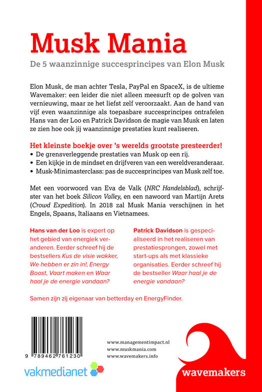 Elon Musk, de man achter Tesla, PayPal en SpaceX, is de ultieme wavemaker: een leider die niet alleen meesurft op de golven van vernieuwing, maar ze het liefst zelf veroorzaakt. Aan de hand van vijf even waanzinnige als toepasbare succesprincipes ontrafelen Hans van der Loo en Patrick Davidson de magie van Musk en laten ze je zien hoe ook jij fantastische prestaties kunt realiseren.