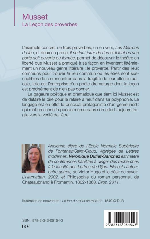 L'exemple concret de trois proverbes, un en vers, Les Marrons du feu, et deux en prose Il ne faut jurer de rien et Il faut qu'une porte soit ouverte ou fermée, permet de découvrir le théâtre en liberté que Musset a pratiqué à sa façon en inventant littéralement un nouveau genre littéraire : le proverbe. La gageure poétique et dramatique que tient ici Musset est de défaire le dire pour le refaire à neuf dans sa polyphonie.