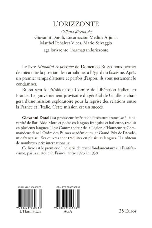 Domenico Russo est né à Naples le 5 avril 1876. Il meurt le 10 mai 1947. Résumé essentiel de sa vie : militant catholique entre 1895 et 1903, à Naples, journaliste des relations entre la France et l’Italie entre 1904 et l’avènement du fascisme en 1922 – depuis 1903 il est à Paris, en correspondant de la presse catholique italienne –, délégué officieux en France du Parti populaire italien entre 1919 et 1926, représentant de premier plan des relations avec les exilés catholiques italiens durant la période fasciste, journaliste catholique antifasciste dans l’entre-deux guerres, enfin responsable de missions diplomatiques entre la France et l’Italie, durant la seconde guerre mondiale. La narration de Domenico Russo sur la naissance du fascisme ne doit pas dérouter. On est au tout début de la dictature fasciste. Mais Russo entrevoit clairement les dangers. « L’assassinat de Matteotti, le démantèlement systématique du régime parlementaire italien, l’arrivée à Paris de Sturzo l’amenèrent à changer radicalement d’attitude. Démocrate sincère, Russo partagea le combat des exilés ‘populaires’ contre la dictature mussolinienne » (J.-L. Pouthier). Russo sera de plus en plus lucide sur le fascisme. Il faut relire ses articles. On aura un panorama de la position nette du Parti populaire en exil. Russo devance beaucoup d’éléments de la lecture du fascisme ces dernières décennies. Le livre Mussolini et fascisme de Domenico Russo nous permet de mieux lire la position des catholiques à l’égard du fascisme. Après un premier temps d’attente et parfois d’espoir, ils vont nettement le condamner. Russo sera le Président du Comité de Libération italien en France. Le gouvernement provisoire du général de Gaulle le chargera d’une mission exploratoire pour la reprise des relations entre la France et l’Italie. Cette mission est un succès.