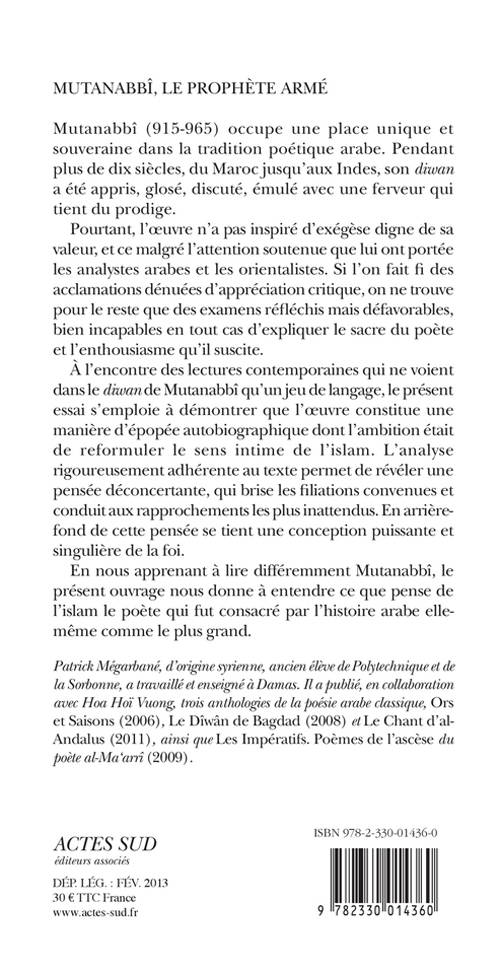 Mutanabbî (915-965) occupe une place unique et souveraine dans la tradition poétique arabe. Pendant plus de dix siècles, du Maroc jusqu'aux Indes, son «diwan» a été appris, glosé, discuté, émulé avec une ferveur qui tient du prodige.