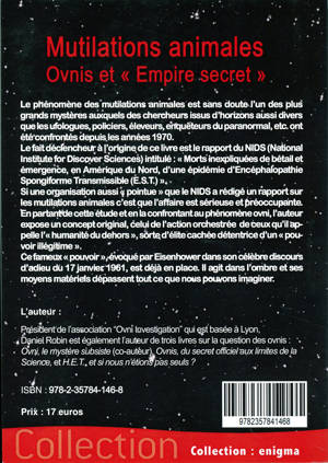 Le phénomène des mutilations animales est sans doute l'un des plus grands mystères auxquels des chercheurs issus d'horizons aussi divers que les ufologues, policiers, éleveurs, enquêteurs du paranormal, etc. ont été confrontés depuis les années 1970. Le fait déclencheur à l'origine de ce livre est le rapport du NIDS (National Institute for Discover Sciences) intitulé : « Morts inexpliquées de bétail et émergence, en Amérique du Nord, d'une épidémie d'Encéphalopathie Spongiforme Transmissible (E.S.T.) ». Si une organisation aussi « pointue » que le NIDS a rédigé un rapport sur les mutilations animales, c'est que l'affaire est sérieuse et préoccupante. En partant de cette étude et en la confrontant au phénomène ovni, l'auteur expose un concept original, celui de l'action orchestrée de ceux qu'il appelle l'« humanité du dehors », sorte d'élite cachée détentrice d'un « pouvoir illégitime ». Ce fameux « pouvoir », évoqué par Eisenhower dans son célèbre discours d'adieu du 17 janvier 1961, est déjà en place. Il agit dans l'ombre et ses moyens matériels dépassent tout ce que nous pouvons imaginer.