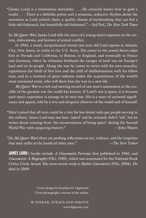 In 1942, a timid, inexperienced twenty-one-year-old Lord reports to Atlantic City, New Jersey, to enlist in the U.S. Army. His career in the armed forces takes him to Nevada, California, Boston, England, and, eventually, France and Germany, where he witnesses firsthand the ravages of total war on Europe's land and on its people. Along the way he comes to terms with his own sexuality, experiences the thrill of first love and the chill of disillusionment with his fellow man, and in a moment of great rashness makes the acquaintance of the world's most renowned artist, who will show him the way to a new life. My Queer War is a rich and moving record of one man's maturation in the crucible of the greatest war the world has known. If his war is queer, it is because each man's experience is strange in its own way. His is a story of universal significance and appeal, told by a wry and eloquent observer of the world and of himself.