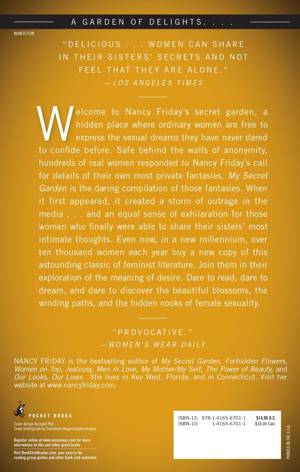 Newly repackaged, the groundbreaking bestseller that explores female sexuality through women's most intimate fantasies.Welcome to Nancy Friday's secret garden, a hidden place where ordinary women are free to express the sexual dreams they have never dared to confide before. Safe behind the walls of anonymity, hundreds of real women responded to Nancy Friday's call for details of their own most private fantasies. My Secret Garden is the daring compilation of those fantasies. When it first appeared, it created a storm of outrage in the media...and an equal sense of exhilaration for those women who finally were able to share their sisters' most intimate thoughts. Even now, in a new millennium, over then thousand women each year buy a new copy of this astounding classic of feminist literature. Join them in their exploration of the meaning of desire. Dare to read, dare to dream, and dare to discover the beautiful blossoms, the winding paths, and the hidden nooks of female sexuality.