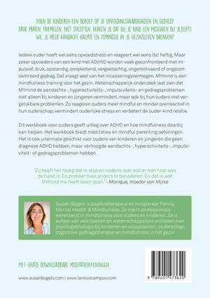 Dit werkboek voor ouders geeft uitleg over ADHD en hoe mindfulness daarbij kan helpen. Het werkboek biedt meditaties en mindful parenting oefeningen. Het is ook geschikt voor ouders van kinderen en jongeren die geen diagnose ADHD hebben, maar verhoogde aandachts-, hyperactiviteits-, impulsiviteit- of gedragsproblemen hebben.