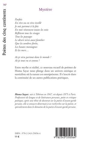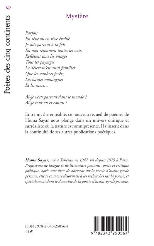 Parfois En rêve ou en rêve éveillé Je suis partout à la fois En moi résonnent toutes les voix Reflètent tous les visages Tous les paysages Le désert m’est aussi familier Que les sombres forêts, Les hautes montagnes Et les mers... Ai-je vécu partout dans le monde ? Ai-je tout vu et connu ? Entre mythe et réalité, ce nouveau recueil de poèmes de Homa Sayar nous plonge dans un univers onirique et surréaliste où la nature est omniprésente. Il s’inscrit dans la continuité de ses autres publications poétiques.