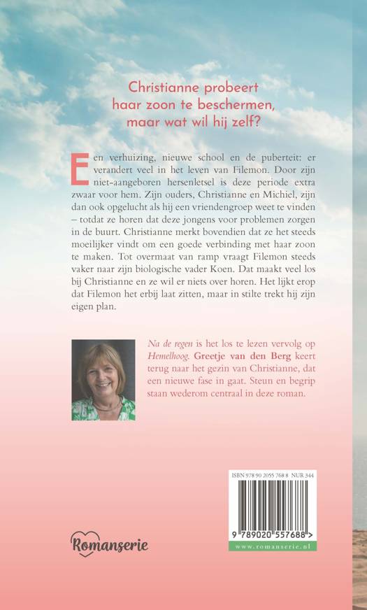 'Na de regen' is het tweede en laatste deel van de In de stem van de wind-duologie van Greetje van den Berg. Ze laat zien wat de impact is van niet-aangeboren hersenletsel binnen een gezin. Christianne wil goed voor haar zoon zorgen, maar wat is het juiste voor hen beiden? Lees ook deel 1: 'Hemelhoog'.