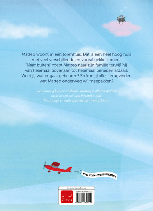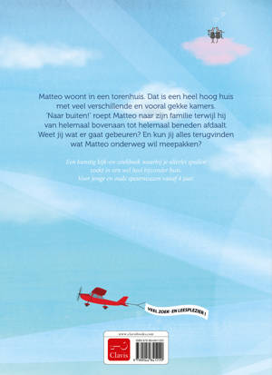 Matteo woont in een torenhuis. Dat is een heel hoog huis met veel verschillende en vooral gekke kamers. ‘Naar buiten!’ roept Matteo naar zijn familie terwijl hij van helemaal bovenaan tot helemaal beneden afdaalt. Weet jij wat er gaat gebeuren? En kun jij alles terugvinden wat Matteo onderweg wil meepakken?