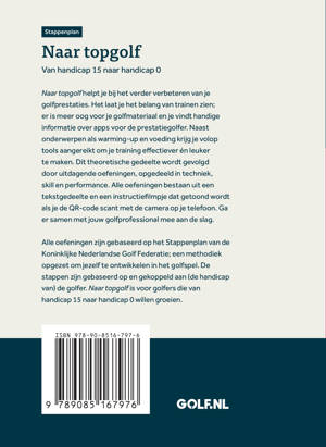 Naar topgolf helpt je bij het verder verbeteren van je golfprestaties. Het laat je het belang van trainen zien; er is meer oog voor je golfmateriaal en je vindt handige informatie over apps voor de prestatiegolfer. Naast onderwerpen als warming-up en voeding krijg je volop tools aangereikt om je training effectiever én leuker te maken. Dit theoretische gedeelte wordt gevolgd door uitdagende oefeningen, opgedeeld in techniek, skill en performance. Alle oefeningen bestaan uit een tekstgedeelte en een instructiefilmpje dat getoond wordt als je de QR-code scant met de camera op je telefoon. Ga er samen met jouw golfprofessional mee aan de slag.