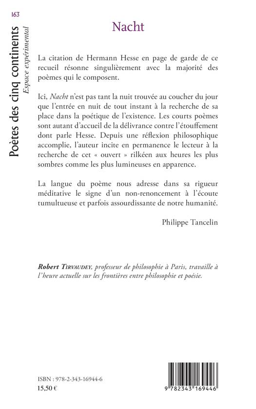 Ici, Nacht n'est pas tant la nuit trouvée au coucher du jour que l'entrée en nuit de tout instant à la recherche de sa place dans la poétique de l'existence. Les courts poèmes sont autant d'accueil de la délivrance contre l'étouffement dont parle Hesse. Depuis une réflexion philosophique accomplie, l'auteur incite en permanence le lecteur à la recherche de cet « ouvert » rilkéen aux heures les plus sombres comme les plus lumineuses en apparence.