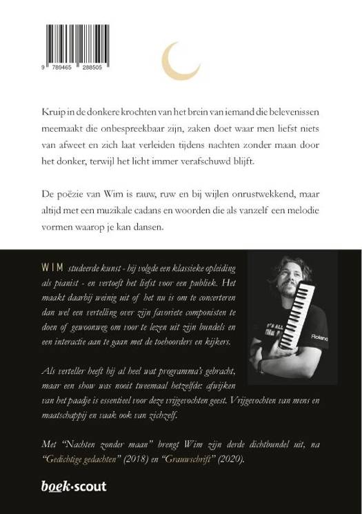 Kruip in de donkere krochten van het brein van iemand die belevenissen meemaakt die onbespreekbaar zijn, zaken doet waar men liefst niets van afweet en zich laat verleiden tijdens nachten zonder maan door het donker, terwijl het licht immer verafschuwd blijft. De poëzie van Wim is rauw, ruw en bij wijlen onrustwekkend, maar altijd met een muzikale cadans en woorden die als vanzelf een melodie vormen waarop je kan dansen.
