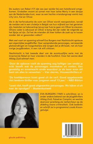 Met veel vaart en spanning schreef Eva Burgers met Nachtvlucht opnieuw een eigentijdse jeugdthriller. Haar aansprekende personages, verrassende plotwendingen en toegankelijke stijl zorgen dat je dit boek, net als haar vorige jeugdboeken, in een ruk wilt uitlezen.