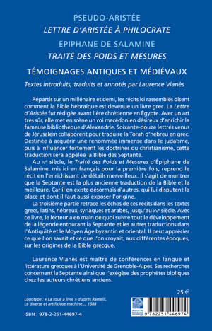 Repartis sur un millenaire et demi, les recits ici rassembles disent comment la Bible hebraique est devenue un livre grec. La Lettre d'Aristee fut redigee avant l'ere chretienne en Egypte. Avec un art tres sur, elle met en scene un roi macedonien desireux d'enrichir la fameuse bibliotheque d'Alexandrie. Soixante-douze lettres venus de Jerusalem collaborent pour traduire la Torah d'hebreu en grec. Destinee a acquerir une renommee immense dans le judaisme, puis a influencer fortement les doctrines du christianisme, cette traduction sera appelee la Bible des Septante.Au IVe siecle, le Traite des Poids et Mesures d'Epiphane de Salamine, mis ici en francais pour la premiere fois, reprend le recit en l'enrichissant de details merveilleux. Il s'agit de montrer que la Septante est la plus ancienne traduction de la Bible et la meilleure. Car il en existe desormais d'autres, qui lui disputent la place et dont il faut aussi exposer l'origine. La troisieme partie retrace les echos de ces recits dans les textes grecs, latins, hebreux, syriaques et arabes, jusqu'au XVe siecle. Avec ce livre, le lecteur a en main de quoi suivre tout le developpement de la legende entourant la Septante et les autres traductions dans l'Antiquite et le Moyen Age byzantin et oriental. Il peut apprecier ce que l'on savait et ce que l'on croyait, aux differentes epoques, sur les origines de la Bible grecque.