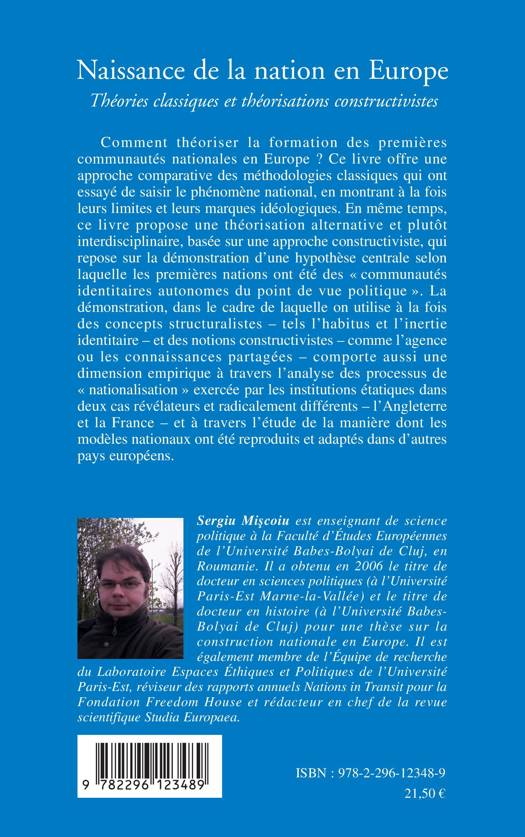 Voici une approche comparative des méthodologies classiques qui ont essayé de saisir le phénomène "national", en montrant leurs limites et leurs marques idéologiques. Il propose une théorisation alternative et interdisciplinaire, basée sur une approche constructiviste. Cette étude comporte aussi une dimension empirique à travers l'analyse des processus de "nationalisation" de l'Angleterre et de la France et l'étude de la manière dont les modèles nationaux ont été reproduits et adaptés dans d'autres pays européens.