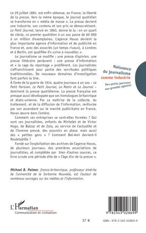 Paru en 1983 sous le titre: Des petits journaux aux grandes agences. Naissance du journalisme moderne, 1863-1914, aux éditions Aubier, et aujourd'hui, épuisé, le texte d'origine de Michael B. Palmer, franco-britannique, est édité complété d'une postface. Référence bibliographique incontournable de l'histoire de "l'âge d'or de la presse", fondée sur l'exploitation des archives de l'agence Havas, de plusieurs journaux, des premières associations de journalistes et de bien d'autres sources, l'étude de Palmer est donc à nouveau disponible.