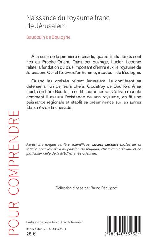 À la suite de la première croisade, quatre États francs sont nés au Proche-Orient. Dans cet ouvrage, Lucien Leconte relate la fondation du plus important d'entre eux, le royaume de Jérusalem. Ce fut l'oeuvre d'un homme, Baudouin de Boulogne. Quand les croisés prirent Jérusalem, ils confièrent sa défense à l'un de leurs chefs, Godefroy de Bouillon. À sa mort, son frère Baudouin se fit couronner roi. Ce livre raconte comment il assura l'existence de son royaume, en fit une puissance régionale et établit sa prééminence sur les autres États nés de la croisade.
