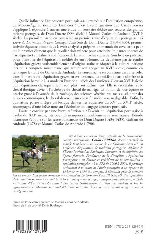 Quelle influence l'art équestre portugais a-t-il exercée sur l'équitation européenne, du Moyen-Âge au siècle des Lumières ? C'est à cette question que Carlos Pereira s'applique à répondre à travers une étude universitaire dédiée aux uvres des grands maîtres portugais, de Dom Duarte (XVe siècle) à Manuel Carlos de Andrade (XVIIIe siècle).