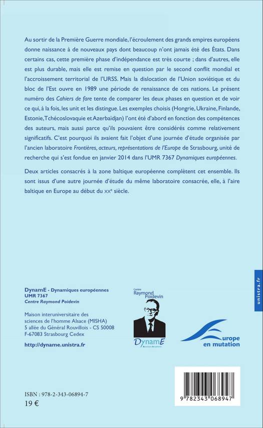 Au sortir de la Première Guerre Mondiale, l'écroulement des grands empires européens donne naissance à de nouveaux pays dont beaucoup n'ont jamais été des Etats. Cette phase d'indépendance est ensuite remise en cause par le second conflit mondial, mais la dislocation de l'Union soviétique en 1989 représentera une période de renaissance de ces nations. Le présent numéro des Cahiers de fare tente de comparer les deux phases en question et de voir ce qui, à la fois, les unit et les distingue.