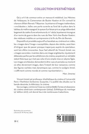 Qu'y a-t-il de commun entre un manuscrit medieval, Les Menines de Velazquez, le Cameraman de Buster Keaton et On connait la chanson d'Alain Resnais ? Reponse: la presence d'images inattendues, " enchassees ", telles une porte ouverte au fond de la piece dans le tableau du maitre espagnol, la queue d'un faisan pris au piege debordant largement du cadre d'une enluminure du XIVe siecle, la presence incongrue d'un navire de guerre dans les rues de New York chez Buster Keaton, des meduses mobiles en surimpression a la fin du film de Resnais. Dispositifs et procedes aujourd'hui banalises au cinema et en video, les " images dans l'image " susceptibles, depuis des siecles, aussi bien d'intriguer que de passer presque inapercues aupres du spectateur, sont loin d'etre innocentes. Sous l'oeil attentif de Vincent Amiel, ces " images-secondes " inserees dans une image-englobante, injustement delaissees parfois par les estheticiens du cinema, acquierent un veritable statut theorique qui n'est pas celui d'une simple mise en abyme figee. Les images enchassees demandent a etre vues et pensees au moment ou elles deviennent images, dans l'instant de leur naissance, comme des figures cachees mais dynamiques qui, comme le souligne Amiel, " s'affirment comme monde et comme representation ".