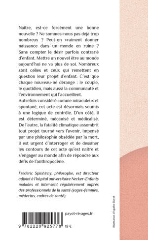 Naître, est-ce forcément une bonne nouvelle ? Ne sommes-nous pas déjà trop nombreux ? Peut-on vraiment donner naissance dans un monde en ruine ? Sans compter le désir parfois contrarié d'enfant. Mettre un nouvel être au monde aujourd'hui ne va plus de soi. Nombreux sont celles et ceux qui remettent en question leur projet d'enfant. C'est que chaque nouveau-né dérange : le couple, le quotidien, mais aussi la communauté et l'environnement qui l'accueillent. Autrefois considéré comme miraculeux et spontané, cet acte est désormais soumis à une logique de contrôle. D'un côté, il est déterminé, mécanisé et médicalisé. De l'autre, la fatalité climatique assombrit tout projet tourné vers l'avenir. Impensé par une philosophie obsédée par la mort, il est urgent d'interroger et de dessiner les contours de cet acte qu'est naître et s'engager au monde afin de répondre aux défis de l'anthropocène.
