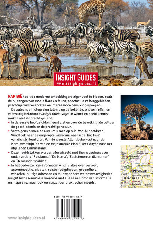 De auteurs en fotografen laten u op de bekende, onovertroffen en veelvuldig bekroonde Insight Guide-wijze in woord en beeld kennismaken met dit prachtige land. In de eerste hoofdstukken leest u alles over de bevolking, de cultuur, de geschiedenis en de prachtige natuur. Vervolgens nemen de auteurs u mee op reis. Van de hoofdstad Windhoek naar de ongerepte wildernis waar u de 'Big Five' van dichtbij kunt zien. Van de woeste Atlantische kust naar de uitgestrekte Namibwoestijn, en van de majestueuze Fish River Canyon naar het afgelegen Damaraland. Deze hoofdstukken worden afgewisseld met thema- en wetenswaardpagina's over onder andere 'Rotskunst', 'Edelstenen en diamanten', 'Gevaarlijke dieren' en 'Beroemde scheepswrakken'. De gedetailleerde kaarten en prachtige kleurenfoto's maken deze gids compleet.