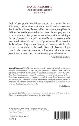 Fruit d'une production ininterrompue de plus de 70 ans d'écriture, l'oeuvre abondante de Nanos Valaoritis comprend des livres de poèmes, des nouvelles, des romans, des pièces de théâtre, des essais, des études littéraires. Auteur polymorphe transcendant tous les genres et toutes les écritures, celui que Jacques Lacarrière a appelé un troubladour a toujours mêlé insolite et insolence, humour et vertige, culture et déconstruction de la culture. Toujours en devenir, son oeuvre s'établit à la croisée du surréalisme, du modernisme, de l'écriture logocentrée, du postmodernisme et de l'intertextualité tout en se jouant avec humour des conventions des genres littéraires Constantin Kaïtéris