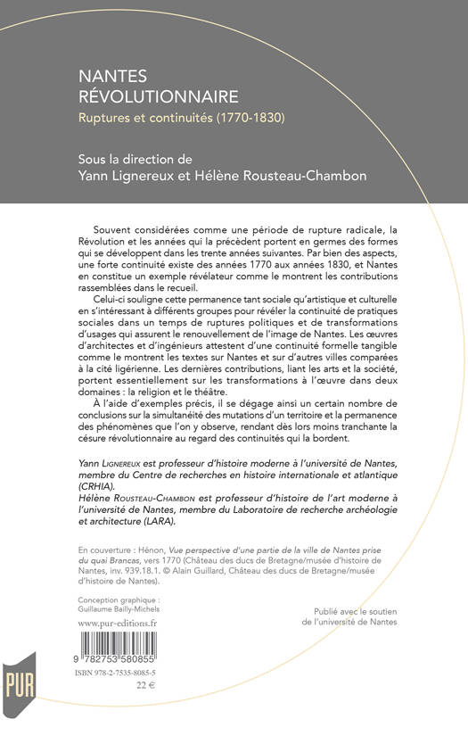 Souvent considérées comme une période de rupture radicale, la Révolution et les années qui la précèdent portent en germes des formes qui se développent dans les trente années suivantes. Par bien des aspects, une forte continuité existe des années 1770 aux années 1830, et Nantes en constitue un exemple révélateur comme le montrent les contributions rassemblées dans le recueil.