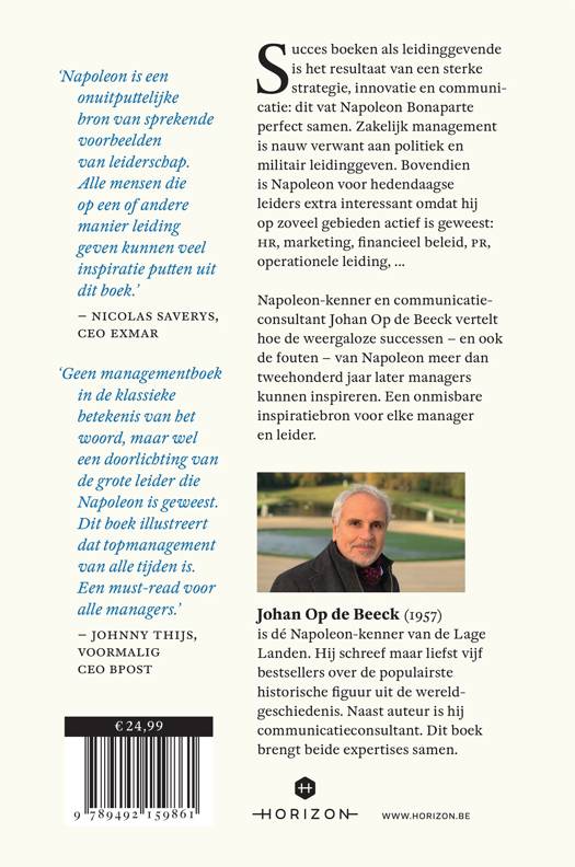 Zakelijk management is nauw verwant aan politiek en militair leidinggeven. Succes is het resultaat van een sterke strategie, constante evaluatie van de omstandigheden en de juiste antwoorden hierop: dit vat Napoleon Bonaparte perfect samen. Bovendien is hij voor hedendaagse leiders extra interessant omdat hij op zoveel gebieden actief is geweest: HR, marketing, financieel beleid, operationele leiding, ... Napoleon-kenner en communicatieconsultant Johan Op de Beeck vertelt hoe de weergaloze successen - en ook de fouten - van Napoleon meer dan tweehonderd jaar later managers kunnen inspireren.