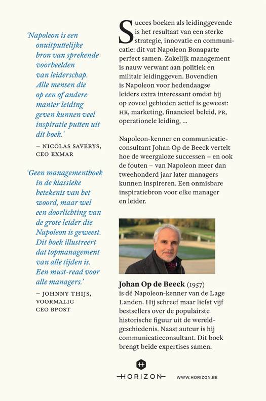 Zakelijk management is nauw verwant aan politiek en militair leidinggeven. Succes is het resultaat van een sterke strategie, constante evaluatie van de omstandigheden en de juiste antwoorden hierop: dit vat Napoleon Bonaparte perfect samen. Bovendien is hij voor hedendaagse leiders extra interessant omdat hij op zoveel gebieden actief is geweest: HR, marketing, financieel beleid, operationele leiding, ... Napoleon-kenner en communicatieconsultant Johan Op de Beeck vertelt hoe de weergaloze successen - en ook de fouten - van Napoleon meer dan tweehonderd jaar later managers kunnen inspireren.