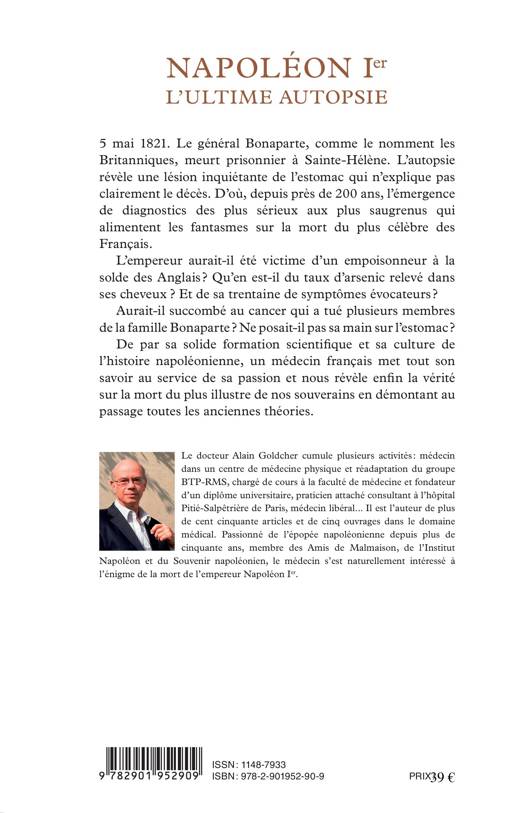 Napoléon Ier meurt le 5 mai 1821, prisonnier à Sainte-Hélène. L'autopsie alors réalisée n'expliquera jamais clairement les causes du décès : l'empereur aurait-t-il été victime d'un empoisonneur à la solde des Anglais ? Qu'en est-il du taux d'arsenic relevé dans ses cheveux ? Ne posait-il pas sa main sur l'estomac ? Le docteur Alain Goldcher, médecin français passionné de l'épopée napoléonienne, lève ici le voile sur la mort du plus célèbre des français.