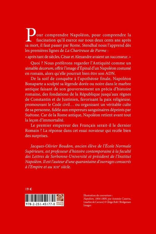 Pour comprendre Napoleon, pour comprendre la fascination qu'il exerce sur nous deux cents ans apres sa mort, il faut passer par Rome. Stendhal nous l'apprend des les premieres lignes de La Chartreuse de Parmeapres tant de siecles, Cesar et Alexandre avaient un successeur. Quoi ? Nous preferons regarder l'Antiquite comme un aimable decorum, offrir l'image d'Epinal d'un Napoleon costume en Romain, alors qu'elle pourrait bien etre son ADN. De la soif de conquete a l'apotheose finale, Napoleon Bonaparte a sculpte sa legende doree ou noire dans le marbre antique faisant de son gouvernement un precis d'histoire romaine, des fondations de la Republique jusqu'aux regnes de Constantin et de Justinien, favorisant la paix religieuse, promouvant le Code civil... ou organisant un veritable culte de sa personne, fidele aux empereurs sanguinaires depeints par Suetone. Car de la Rome antique, Napoleon retient avant tout la lecon d'immortalite. Le premier empereur des Francais serait-il le dernier Romain ? La reponse dans cet essai novateur qui recele bien des surprises.