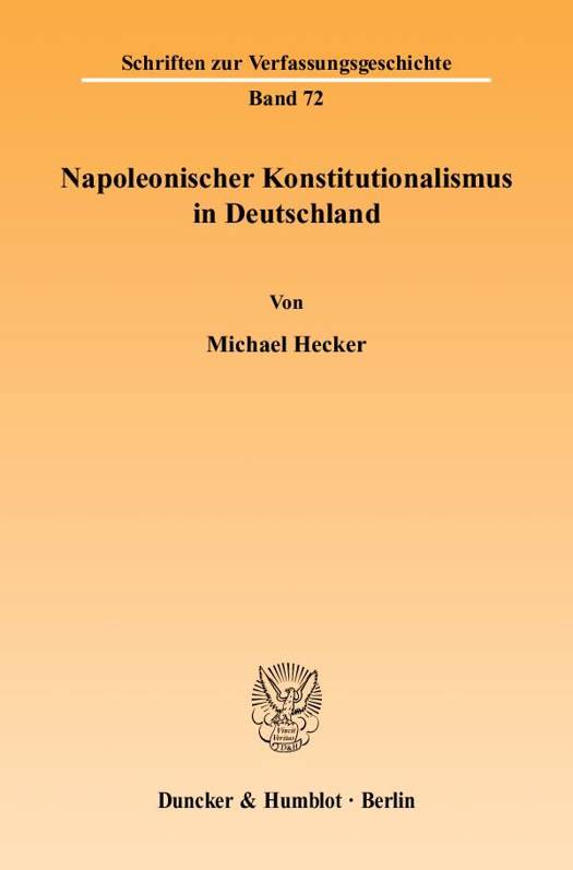 Michael Hecker nimmt eine moderne verfassungsgeschichtliche Betrachtung des (rechtsrheinischen) napoleonischen Deutschlands vor. Korrespondierend zum in der Revisionsforschung vollzogenen Wandel in der Beurteilung der Rheinbundzeit wird er eine insgesamt differenziertere (positivere) Einschätzung des rheinbündisch-napoleonischen Konstitutionalismus abgeben. Sein Thema ist dabei in dreifacher Weise eingegrenzt. Er beschränkt sich zum einen auf die napoleonischen Rheinbundstaaten, d. h. die erst durch Napoleon künstlich geschaffenen und weitgehend französisch geprägten Staaten Berg, Westfalen und (mit Einschränkungen) Frankfurt. Außen vor bleiben die übrigen Rheinbundstaaten. Dies gilt sowohl für die 1808, 1809 und 1810 mit Verfassungen versehenen Staaten Bayern, Sachsen-Weimar und Eisenach sowie Anhalt-Köthen wie etwa auch für die zwar ohne moderne Verfassung, aber nicht ohne modernisierende Gesetzgebung regierten Staaten Baden und Württemberg. Die Beschränkung auf die drei klassischen Napoleoniden folgt der herkömmlichen Gruppenbildung unter den verschiedenen Rheinbundstaaten. Ihr liegt die Erwägung zugrunde, dass die Napoleoniden mit ihrer engen Anknüpfung an das Empire sowie der ihnen im Hinblick auf die übrigen Rheinbundstaaten zugedachten Modellstaatsfunktion einen eigenen Staatstypus nach napoleonischer Handschrift bildeten. Dessen konstitutionelle Strukturen herauszuarbeiten und abzubilden ist Anliegen der Untersuchung.