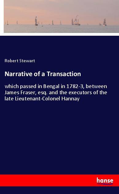 Narrative of a Transaction - which passed in Bengal in 1782-3, between James Fraser, esq. and the executors of the late Lieutenant-Colonel Hannay is an unchanged, high-quality reprint of the original edition of 1787. Hansebooks is editor of the literature on different topic areas such as research and science, travel and expeditions, cooking and nutrition, medicine, and other genres. As a publisher we focus on the preservation of historical literature. Many works of historical writers and scientists are available today as antiques only. Hansebooks newly publishes these books and contributes to the preservation of literature which has become rare and historical knowledge for the future.