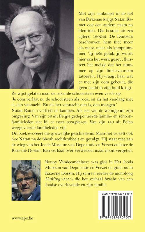 Met zijn aankomst in de hel van Birkenau krijgt Natan Ramet ook een andere naam en identiteit. Die bestaat uit zes cijfers: 160242. De Duitsers beschouwen hem niet meer als mens maar als kampnummer. 'Jij hebt geluk, jij wordt hier aan het werk gezet', fluistert het meisje dat het nummer op zijn linkervoorarm tatoeëert. Hij vraagt haar wat er met zijn oom gebeurt, die géén naald in zijn huid krijgt. Ze wijst gelaten naar de rokende schoorsteen even verderop. 'Je oom verlaat nu de schoorsteen als rook, en als het vandaag niet is, dan vannacht. En als het vannacht niet is, dan morgen.' Natan Ramet overleeft de kampen. Als een van de weinige uit zijn omgeving. Van zijn 58 uit België gedeporteerde familie- en schoonfamilieleden ziet hij er twee terugkeren. Van zijn 140 uit Polen weggevoerde familieleden vijf. Dit boek evoceert die gruwelijke geschiedenis. Maar het vertelt ook hoe Natan na de Shoah rechtkrabbelt en getuigt. Hij staat mee aan de wieg van het Joods Museum van Deportatie en Verzet en later de Kazerne Dossin. Een verhaal over verwerken maar nooit vergeten.