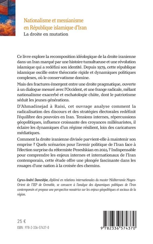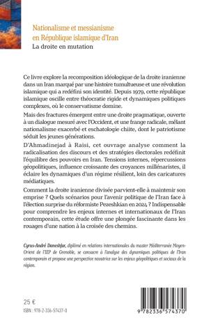 Ce livre explore la recomposition idéologique de la droite iranienne dans un Iran marqué par une histoire tumultueuse et une révolution islamique qui a redéfini son identité. Depuis 1979, cette république islamique oscille entre théocratie rigide et dynamiques politiques complexes, où le conservatisme domine. Mais des fractures émergent entre une droite pragmatique, ouverte à un dialogue mesuré avec l'Occident, et une frange radicale, mêlant nationalisme exacerbé et eschatologie chiite, dont le patriotisme séduit les jeunes générations. D'Ahmadinejad à Raisi, cet ouvrage analyse comment la radicalisation des discours et des stratégies électorales redéfinit l'équilibre des pouvoirs en Iran. Tensions internes, répercussions géopolitiques, influence croissante des croyances millénaristes, il éclaire les dynamiques d'un régime résilient, loin des caricatures médiatiques. Comment la droite iranienne divisée parvient-elle à maintenir son emprise ? Quels scénarios pour l'avenir politique de l'Iran face à l'élection surprise du réformiste Pezeshkian en 2024 ? Indispensable pour comprendre les enjeux internes et internationaux de l'Iran contemporain, cette étude offre une plongée fascinante dans les rouages d'une nation à la croisée des chemins.