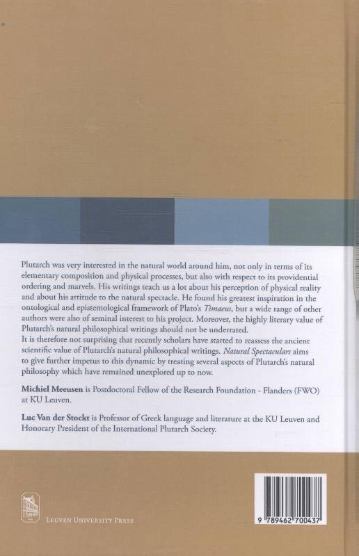 The value of Plutarch's perception of physical reality and his attitude towards the natural spectacle. Plutarch was very interested in the natural world around him, not only in terms of its elementary composition and physical processes, but also with respect to its providential ordering and 'wonders'. His writings teach us a lot about his perception of physical reality and about his attitude to the natural spectacle. He found his greatest inspiration in the ontological and epistemological framework of Plato's Timaeus, but a wide range of other authors were also of seminal interest to his project. Clearly, the highly literary value of Plutarch's natural philosophical writings should not be underrated. It is therefore not surprising that recently scholars have started to reassess the ancient scientific value of Plutarch's natural philosophical writings. Natural Spectaculars aims to give further impetus to this dynamic by treating several aspects of Plutarch's natural philosophy which have remained unexplored up to now.