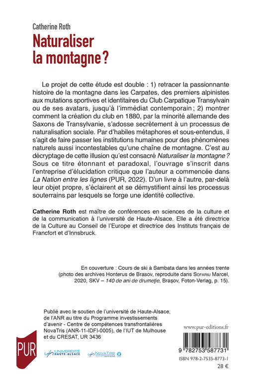 Le projet de cette étude est double : 1) retracer la passionnante histoire de la montagne dans les Carpates, des premiers alpinistes aux mutations sportives et identitaires du Club Carpatique Transylvain ou de ses avatars, jusqu'à l'immédiat contemporain ; 2) montrer comment la création du club en 1880, par la minorité allemande des Saxons de Transylvanie, s'adosse secrètement à un processus de naturalisation sociale. Par d'habiles métaphores et sous-entendus, il s'agit de faire passer les institutions humaines pour des phénomènes naturels aussi incontestables qu'une chaîne de montagne. C'est au décryptage de cette illusion qu'est consacré Naturaliser la montagne ? Sous ce titre étonnant et paradoxal, l'ouvrage s'inscrit dans l'entreprise d'élucidation critique que l'auteur a commencée dans La Nation entre les lignes (PUR, 2022). D'un livre à l'autre, par-delà leur objet propre, s'éclairent et se démystifient ainsi les processus souterrains par lesquels se forge une identité collective.