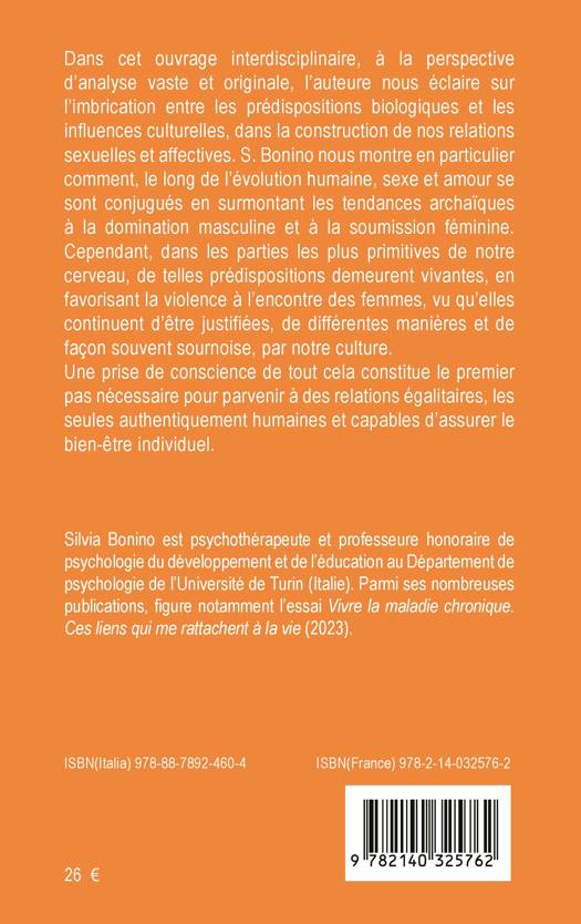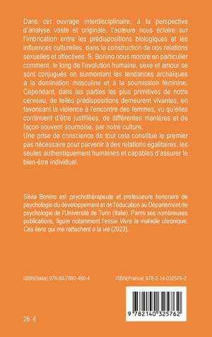 Dans cet ouvrage interdisciplinaire, à la perspective d'analyse vaste et originale, l'auteure nous éclaire sur l'imbrication entre les prédispositions biologiques et les influences culturelles, dans la construction de nos relations sexuelles et affectives. S. Bonino nous montre en particulier comment, le long de l'évolution humaine, sexe et amour se sont conjugués en surmontant les tendances archaïques à la domination masculine et à la soumission féminine. Cependant, dans les parties les plus primitives de notre cerveau, de telles prédispositions demeurent vivantes, en favorisant la violence à l'encontre des femmes, vu qu'elles continuent d'être justifiées, de différentes manières et de façon souvent sournoise, par notre culture. Une prise de conscience de tout cela constitue le premier pas nécessaire pour parvenir à des relations égalitaires, les seules authentiquement humaines et capables d'assurer le bien-être individuel.