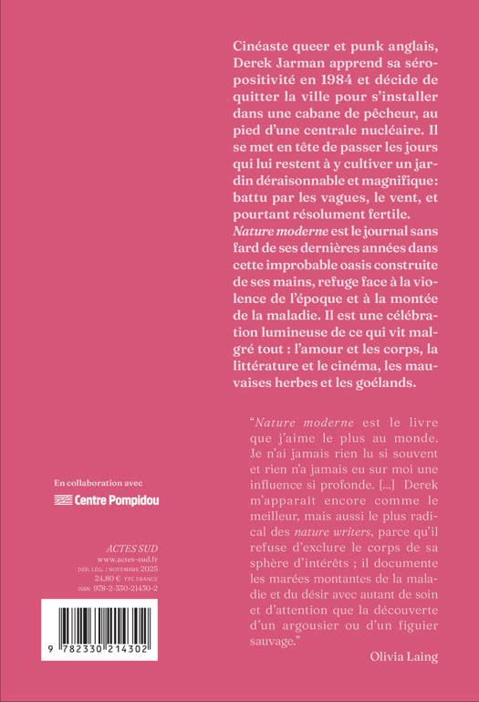 Cinéaste queer et punk anglais, Derek Jarman apprend sa séropositivité en 1984 et décide de quitter la ville pour s'installer dans une cabane de pêcheur, au pied d'une centrale nucléaire. Il se met en tête de passer les jours qui lui restent à y cultiver un jardin déraisonnable et magnifique : battu par les vagues, le vent, et pourtant résolument fertile. Nature moderne est le journal sans fard de ses dernières années dans cette improbable oasis construite de ses mains, refuge face à la violence de l'époque et à la montée de la maladie. Il est une célébration lumineuse de ce qui vit malgré tout : l'amour et les corps, la littérature et le cinéma, les mauvaises herbes et les goélands. "Nature moderne est le livre que j'aime le plus au monde. Je n'ai jamais rien lu si souvent et rien n'a jamais eu sur moi une influence si profonde. [...] Derek m'apparaît encore comme le meilleur, mais aussi le plus radical des nature writers, parce qu'il refuse d'exclure le corps de sa sphère d'intérêts ; il documente les marées montantes de la maladie et du désir avec autant de soin et d'attention que la découverte d'un argousier ou d'un figuier sauvage." Olivia Laing