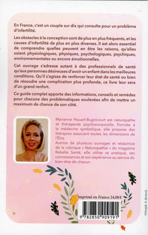 En France, c’est un couple sur dix qui consulte pour un problème d’infertilité. Les problèmes de conceptions sont de plus en plus fréquents, et les causes d'infertilité de plus en plus diverses. Il est alors essentiel de comprendre quelles peuvent être les causes empêchant la conception, qu’elles correspondent au niveau physiologique, physique, psychologique, psychique, environnemental ou encore émotionnel. Cet ouvrage est un état des lieux des différentes causes internes et externes pouvant être des facteurs d'infertilité, à destination des médecins, des naturopathes, des thérapeutes mais aussi des personnes concernées par le désir de devenir parent. Ce guide complet apporte des informations, conseils et remèdes pour chacune des problématiques soulevées afin de mettre un maximum de chance de son côté.