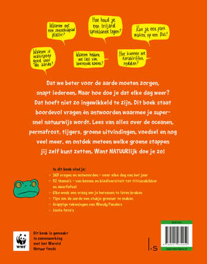 Met NATUURlijk doe je zo zet jij een stap in de groene richting! Want in dit superleuke boek, dat gemaakt is in samenwerking met het Wereld Natuur Fonds en PatsBoem!, worden al jouw vragen over de natuur beantwoord én ontdek je hoe je zelf de aarde een stukje groener maakt. Met grappige tekeningen van Wendy Panders en aansprekende foto’s.