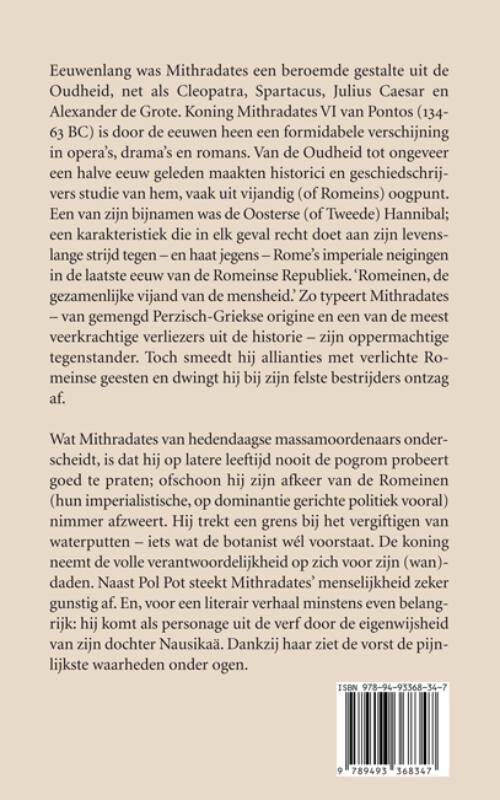 Eeuwenlang was Mithradates een beroemde gestalte uit de Oudheid, net als Cleopatra, Spartacus, Julius Caesar en Alexander de Grote. Koning Mithradates VI van Pontos (134 – 63 BC) is door de eeuwen heen een formidabele verschijning in opera’s, drama’s en romans. Van de Oudheid tot ongeveer een halve eeuw geleden maakten historici en geschiedschrijvers studie van hem, vaak uit vijandig (of Romeins) oogpunt. Een van zijn bijnamen was de Oosterse (of Tweede) Hannibal; een karakteristiek die in elk geval recht doet aan zijn levenslange strijd tegen – en haat jegens – het Rome’s imperiale neigingen in de laatste eeuw van de Romeinse Republiek. ‘Romeinen, de gezamenlijke vijand van de mensheid.’ Zo typeert Mitradates– van gemengd Perzisch-Griekse origine en een van de meest veerkrachtige verliezers uit de historie – zijn oppermachtige tegenstander. Toch smeedt hij allianties met verlichte Romeinse geesten en dwingt hij bij zijn felste bestrijders ontzag af.