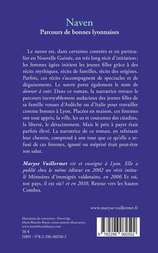 Le naven, ou donner à voir, est, dans certaines contrées et en particulier en Nouvelle Guinée, un très long récit d'initiation ; les femmes âgées initient les jeunes filles grâce à des récits mythiques, récits de familles, récits des origines. Dans ce roman, la narratrice retrace le parcours incroyablement audacieux des jeunes filles de sa famille venues d'Ardèche ou d'Italie pour travailler comme bonnes à Lyon. En refaisant leur chemin, celle-ci comprend que ce qu'elle a refusé de ces femmes, ignoré ou méprisé, était peut-être son salut.