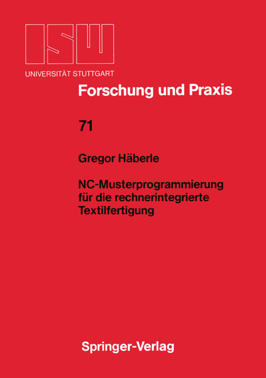 Die vorliegende Arbeit entstand wahrend meiner Tatigkeit als wissenschaftlicher Mitarbeiter am Institut fur Steuerungs- technik der Werkzeugmaschinen und Fertigungseinrichtungen (ISW) der Universitat stuttgart. Herrn Prof. Dr. -Ing. G. Pritschow gilt mein besonderer Dank fur das Interesse an meiner Arbeit, die wohlwollende Unter- stutzung und die Anregungen wahrend der Entstehungszeit. Ebenso danke ich Herrn Prof. Dr. -Ing. A. storr sowie Herrn Dr. -Ing. B. Walker fur ihre sehr hilfreichen Anregungen. Herrn Prof. Dr. -Ing. G. Egbers danke ich fur seine Bereit- schaft, den Mitbericht zu ubernehmen. Daruber hinaus mochte ich mich bei allen Mitarbeiterinnen und Mitarbeitern des Instituts bedanken, die meiner Arbeit durch anregende Kritik und Diskussionen zusatzliche Impulse verlie- hen haben. Mein Dank gilt ferner Herrn Ing. W. Kaselitz und Herrn Dipl. -Ing. (FH) G. Maile, die mich in vielfaltiger Weise unterstutzt haben. Gregor Haberle 7 Inhaltsverzeichnis Seite 10 Abkiirzungen 11 Einleitung Einfiihrung in die Problematik der textilen 13 2 Musterherstellung 2. 1 Textile Fertigungsverfahren 13 2. 2 Aufbau der Muster 13 2. 3 Methoden des Musterentwurfs 16 3 Rechnerunterstiitzte Musterprogrammierung 18 3. 1 Stand der Technik 18 3. 1. 1 Grafische und optische Musterdateneingabe 18 3. 1. 2 Programmieroberflachen der Maschinensteuerungen 22 3. 1. 3 Bewertung der Programmierverfahren 23 3. 2 Schwachstellen und Grenzen der Muster- 25 programmierung 3. 3 Vergleich NC-Werkzeugmaschinenbereich - 28 NC-Textilmaschinenbereich Zielsetzung der Arbeit 32 3. 4 4 Anforderungsprofil einer musterorientierten 34 NC-Programmierschnittstelle Durchgangigkeit des Informationsflusses 34 4. 1 4. 2 Unterschiedliche Programmierorte 35 4.