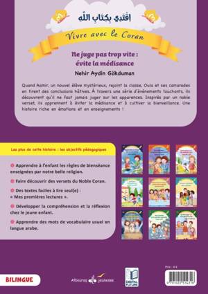 Immergez-vous dans l’univers chaleureux et lumineux de Safia et de sa famille, où chaque jour est l’occasion d’apprendre et de grandir. À travers les petits gestes quotidiens, cette série de 10 livres bilingues guide les enfants vers une compréhension douce et inspirante de valeurs essentielles comme le respect, la générosité, et l’amour familial, le tout éclairé par la sagesse des versets coraniques : 9- Ne juge pas trop vite : Évite la médisanceQuand Aamir, un nouvel élève, rejoint la classe, Safia et ses camarades s’imaginent plein de choses sur lui. Ils découvrent ensuite qu’il ne faut jamais juger sur les apparences. Inspirés par un noble verset, ils apprennent à éviter la médisance et à cultiver la bienveillance.Autres épisodes : 1- Apprendre à s’aimer les uns les autres2- La Confiance : une grande responsabilité 3- La Bienfaisance : les mains du cœur 4- Le Trésor de la Patience5- Main dans la main : Fraternité et amour6- Donner c'est aimer 7- Le Temps, un cadeau précieux8- Des Conseils pour grandir ensemble10- Le Messager (ﷺ) de la Miséricorde