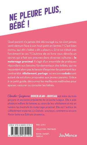 Quel parent n’a jamais été découragé ou ne s’est jamais senti démuni face à son tout-petit en larmes ? C’est bien connu, qui dit « bébé » dit « pleurs ». Et si ce n’était pas forcément le cas ? L’autrice de ce livre vous dévoile un secret qui a fait ses preuves dans diverses cultures : le maternage proximal. Il s’agit d’un ensemble de pratiques répondant aux besoins fondamentaux des bébés, qui ne ressentent alors pas le besoin d’exprimer bruyamment leur contrariété. Allaitement, portage, ou encore cododo sont autant de solutions proposées aux jeunes parents. Grâce à ce petit guide, découvrez les meilleures méthodes pour apaiser, rassurer ou consoler les bébés.