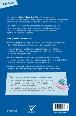 Série bleue Nébulo va vite, très vite… Zut! Il a sali la moto du papa de Rémi. La journée commence mal. Dans ce livre, les mots contiennent : des graphèmes simples : a, e, i, o, l, m, s, etc. des syllabes orales simples : V (voyelle) et CV (consonne, voyelle) des syllabes orales complexes : VC et CVC (dans les mots d’une syllabe ou en fin de mot)